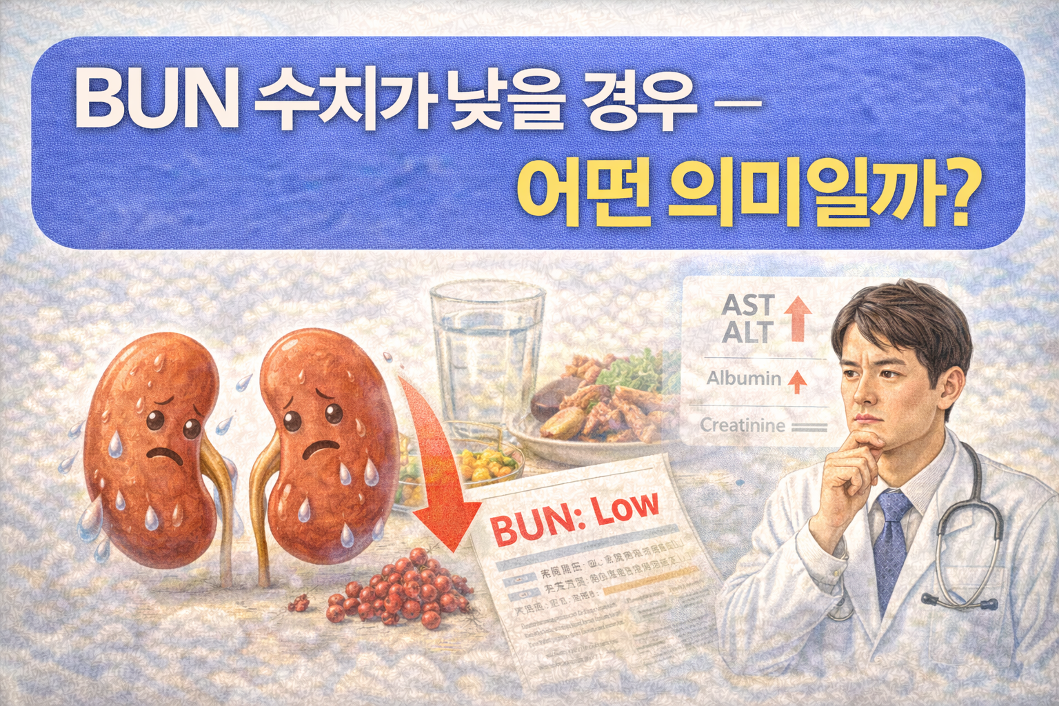 BUN은 간에서 만들어지기 때문에, 간염·간경화·심한 간손상 등이 있으면 생성량이 줄어 수치가 낮게 나올 수 있습니다.